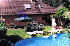 Ferienwohnung für 2 bis 4 Personen in ruhiger Waldrandlage, Wohnzimmer mit Farb-SAT-TV, Küchenzeile und Balkon, separates Schlafzimmer, Dusche/WC, Liegewiese mit Gartenmöbeln, beheizbarer Swimmingpool, Sauna, Parkplatz